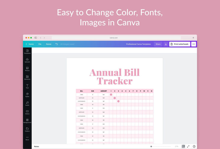 Chinese Pink Annual Bill Tracker Printable and Editable Canva Template